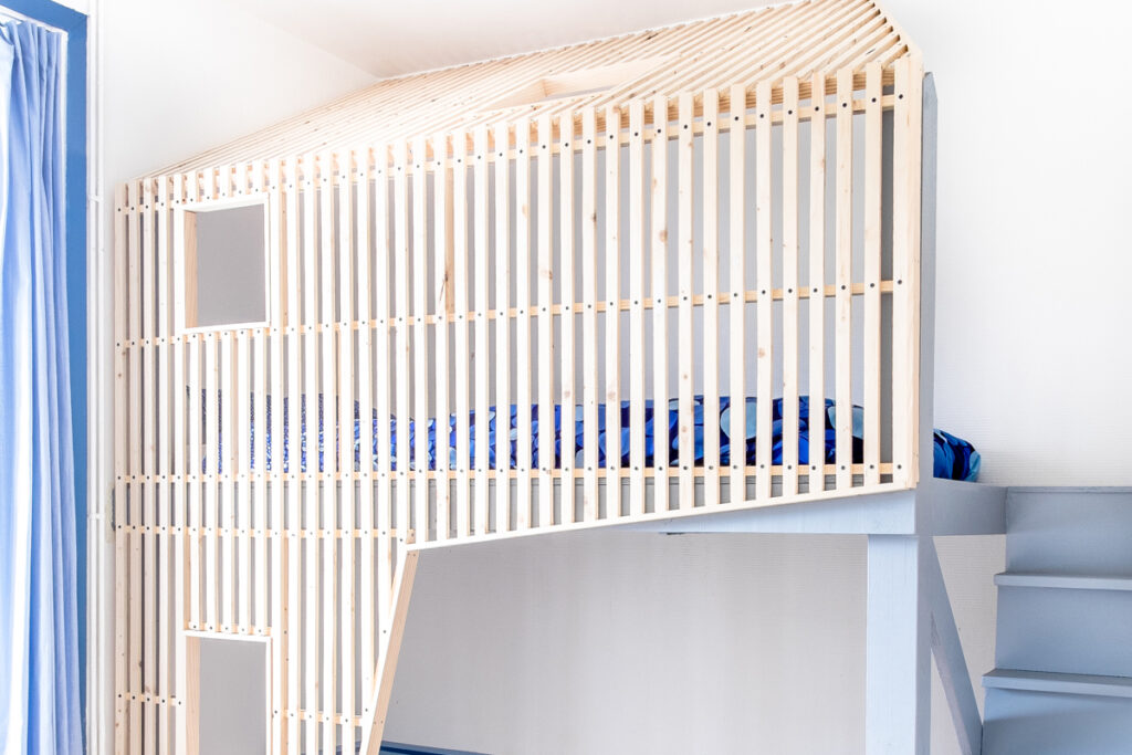 Bretagne - Vannes / 14 m2 Pour faire un peu de place à sa petite soeur dans sa chambre, le lit de Marius devait monter sur une mezzanine. Nous avons proposé une maison dans la maison, avec toit et fenêtres : esprit cabane assuré! Il fallait bien sûr allier le plaisir à la sécurité. Dans un premier temps la mezzanine a été fabriquée sur mesure, peinte en bleue, assortie au couleurs de la chambre (rideaux, soubassements). Des placards ont été placé sous l'escalier pour ne pas perdre de place. Dans un second temps une peau ajourée, fabriquée en tasseaux de pin clair, agrémentée de fenêtres est venue se poser par dessus, comme une enveloppe, créant les murs et le toit de la cabane. Cela permettait donc de profiter d'un espace clôt et sécurisé en haut ainsi que d'un nouvel espace de jeu en bas. Le travail sur les biais permet plus de légèreté visuelle. L'image de la "maison" telle qu'elle est souvent représentée par les enfants est donc bien présente, avec son toit en pente et ses fenêtres mais elle est ici revisitée de façon contemporaine. La cabane a naturellement trouvée sa place dans un retrait de la chambre, à l'instar d'une alcove. Credit photo: Nicolas Aubert-Maguéro Maison PEROUX – Entre tradition et modernité.