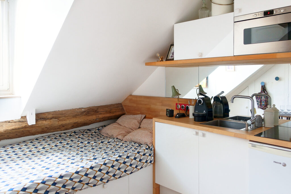 Paris - 2ème / 10 m2 Dans ce studio de 10m2, un travail sur les biais a permis d’allier l’efficacité au confort. Les espaces techniques sont réduits à leur stricte nécessaire afin d'offrir un espace de vie spacieux et lumineux. Pied à terre pour une seul personne, le lit choisi est de 120cm de large pour plus de bien être. Des espaces de rangements exploitent les creux formés par les conduits de cheminées. Des tiroirs ont été positionnés sous le lit. Un grand rideau masque la porte d'entrée et offre une sensation d'intimité.Chaise chinée en métal et formica. Le tableau électrique est caché dans un placard élégant et un ensemble de tableaux complète la déco. Le plateau de la table chinée est en bois brulé. Le propriétaire a su personnaliser son pied à terre pour le rendre chaleureux. Une tablette permet de masquer un peu la présence de l'écran et accentue l'effet déco. La cuisine jouxte la salle de bain. La crédence est constituée de miroir afin d'augmenter la sensation d'espace. La salle de bain est constituée d'une douche de 70x70cm, d'un lavabo et d'un wc. Détail de l'étagère String qui vient apporter du style et de l'espace de rangement dans cette petite salle de bain. Dans la salle de bain, un mélange de carreaux noirs et de carreaux argentés. On augmente l'effet niche mais on illumine l'espace! Un très grand miroir fait tout le mur du côté vasque et agrandit l'espace.. Plan de la pièce. Le traitement en biais, dilate l'espace et crée une sensation d'espace. Vue en 3 dimensions. Crédit photos: Nicolas Aubert-Maguéro